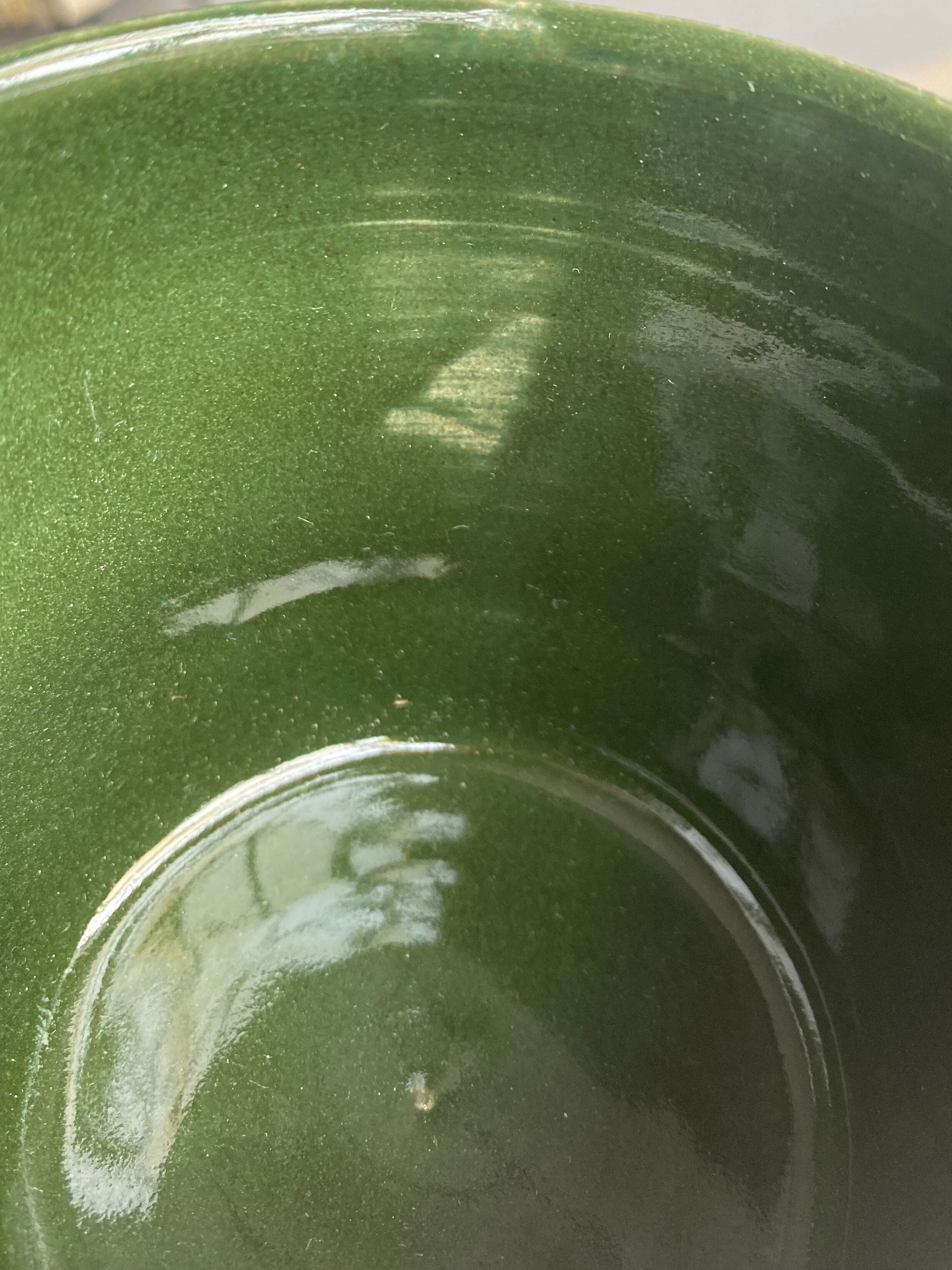 This item is a second and has some chipping on the bottom and a thin glaze spot on the interior, these flaws do not effect its function.